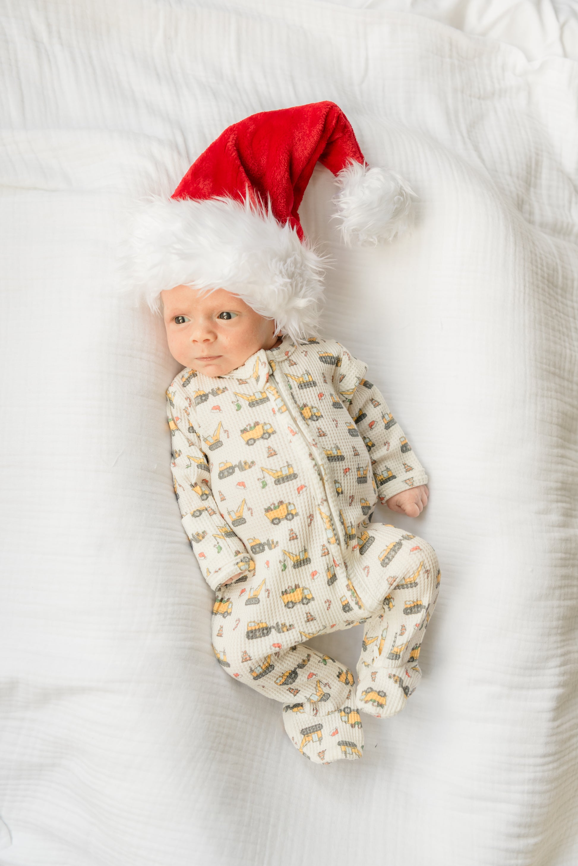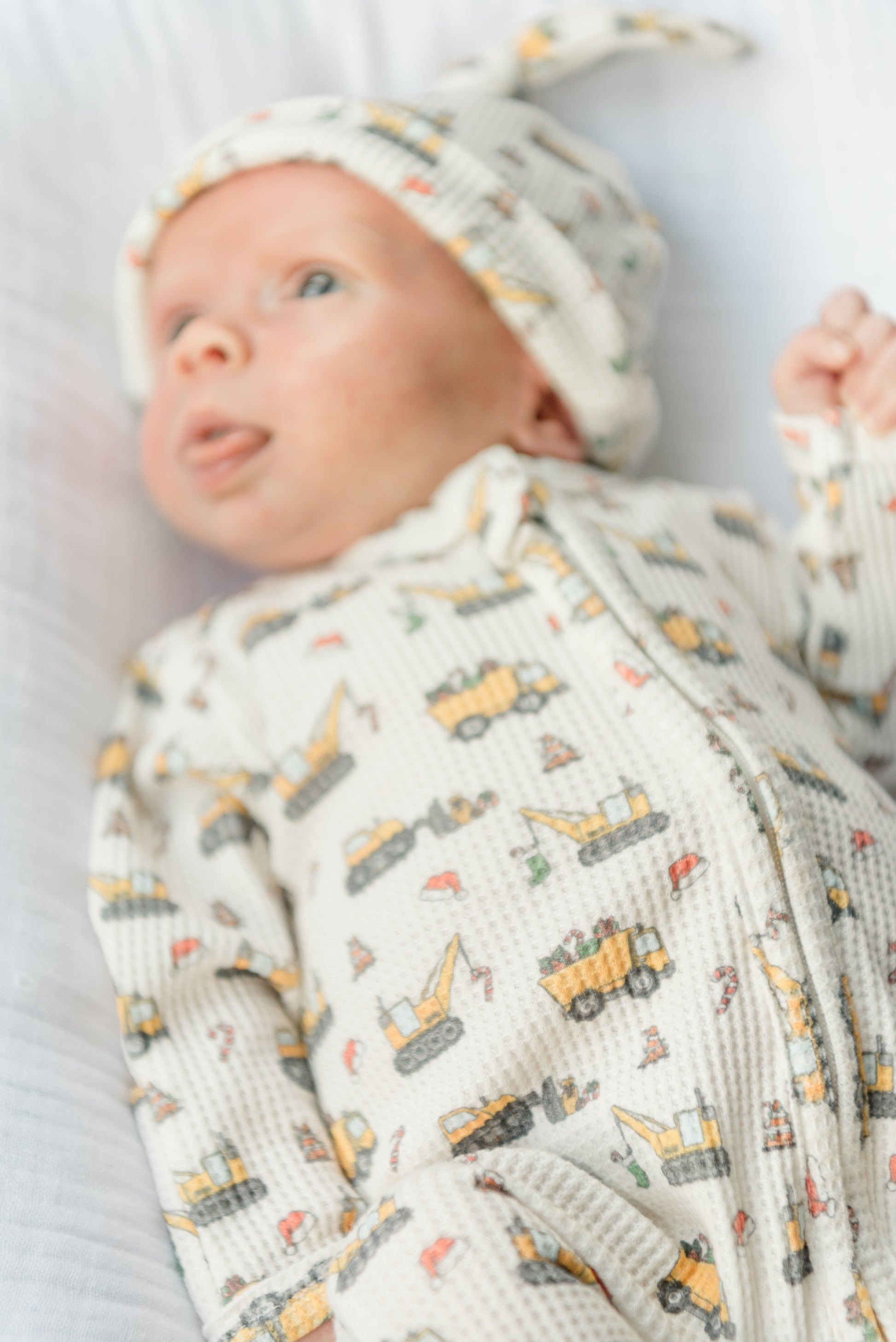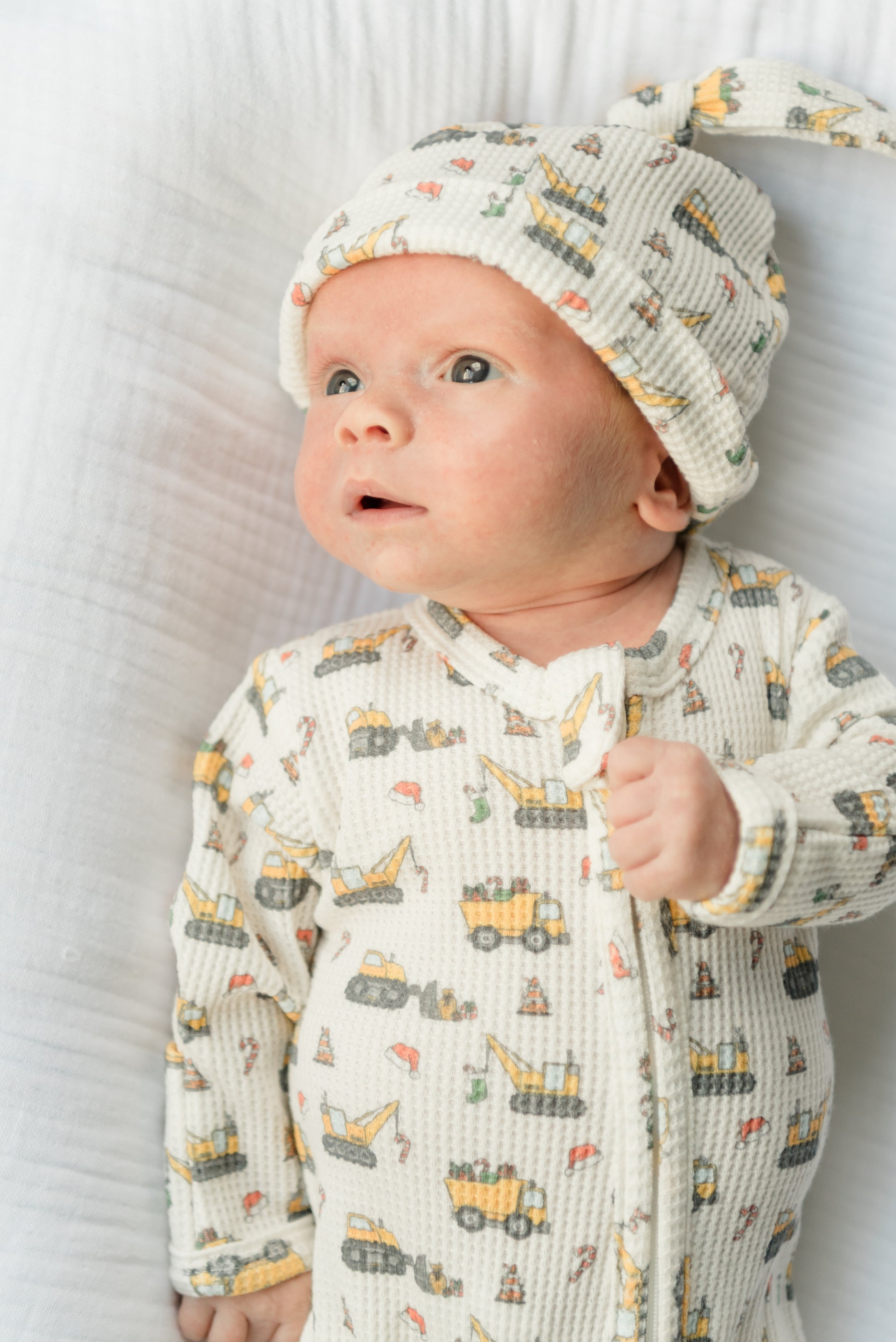 CAUTION! Santa's work zone is under construction! Our bestselling Organic Waffle Knit Footies are now offered in our NEW "Santa's Work Zone" print! Purchase just the footie by itself, or with an adorable matching hat!