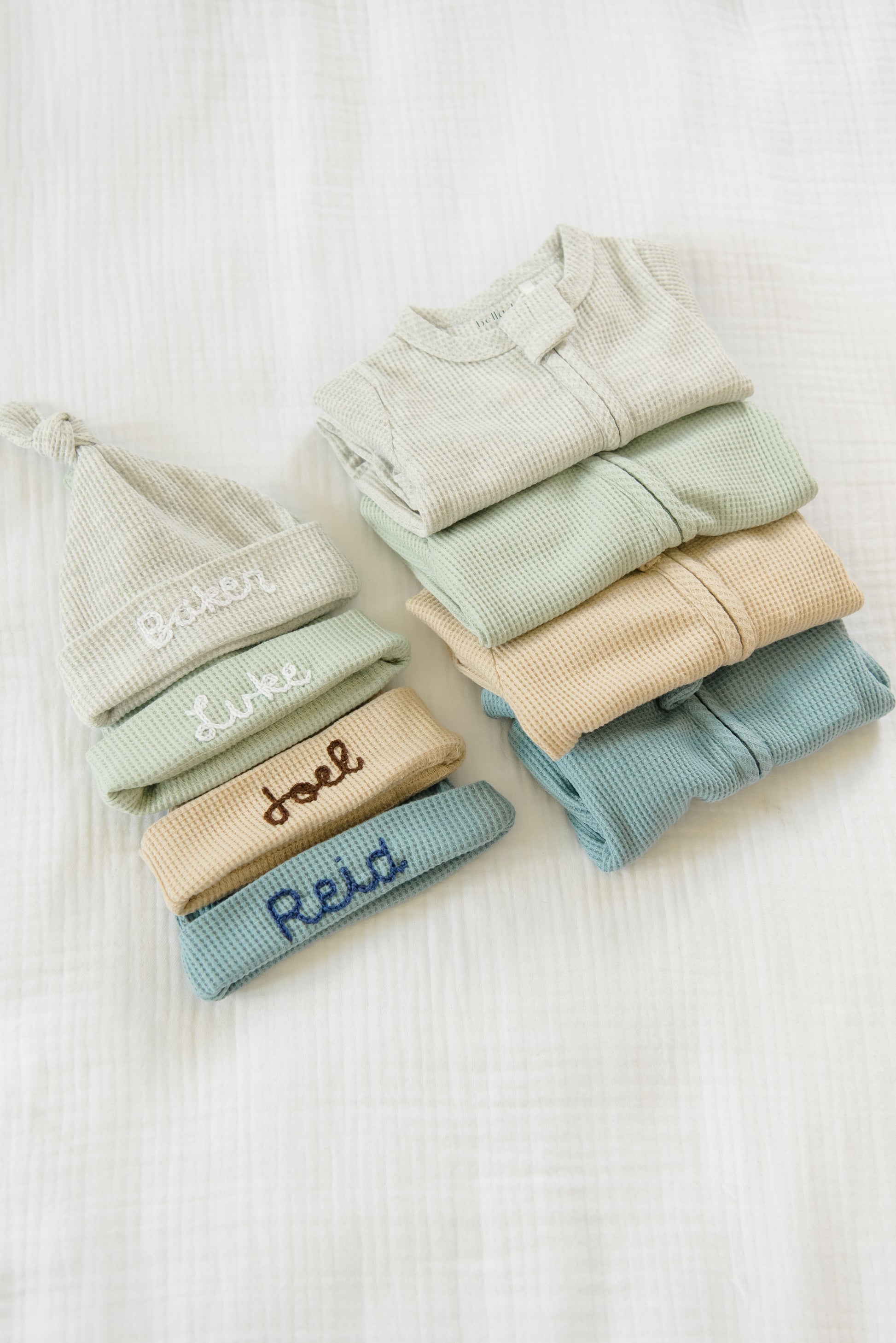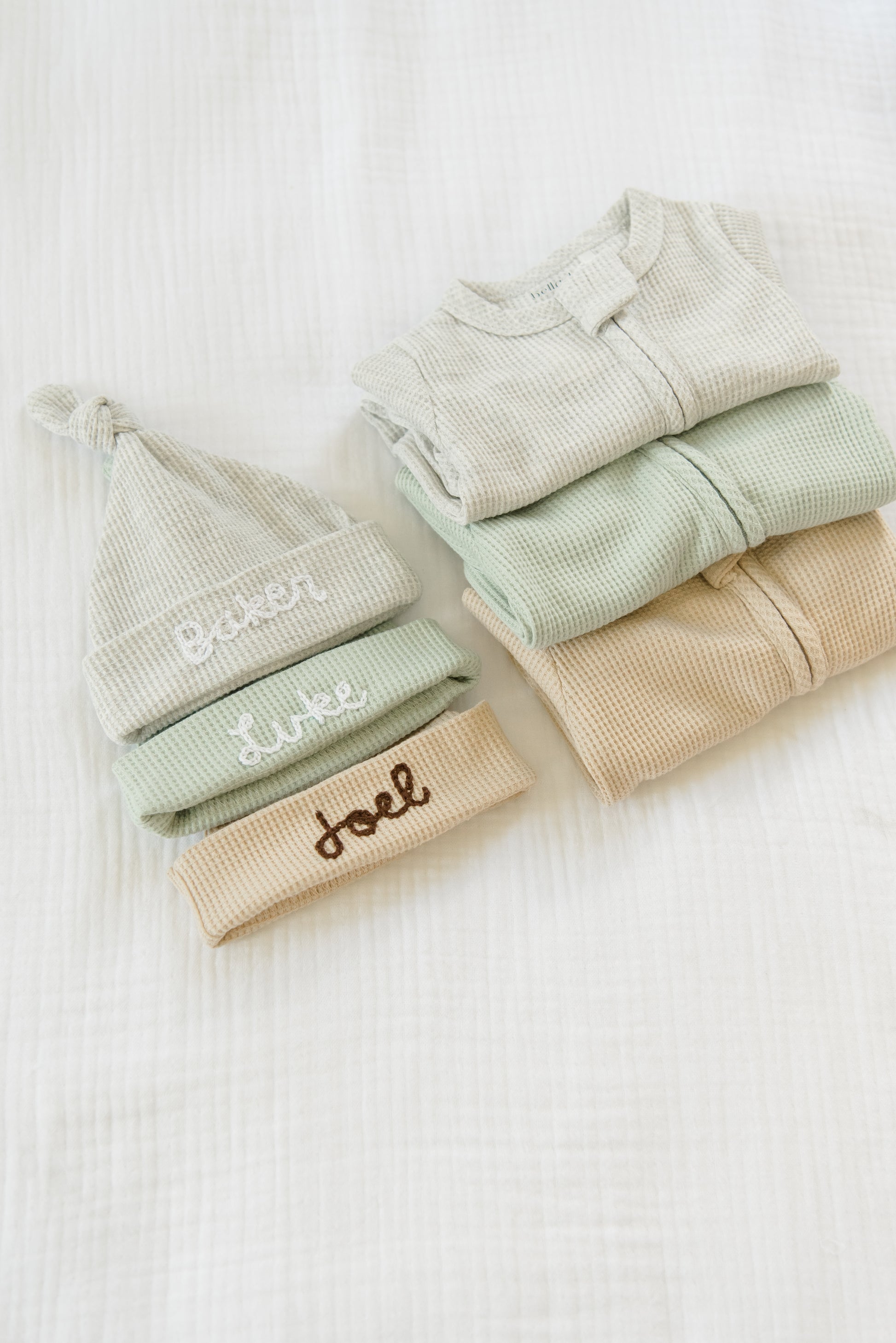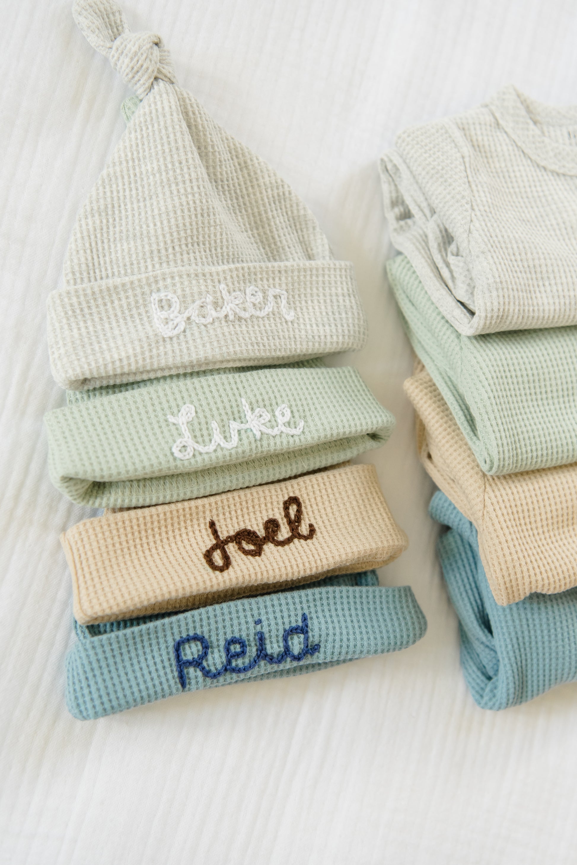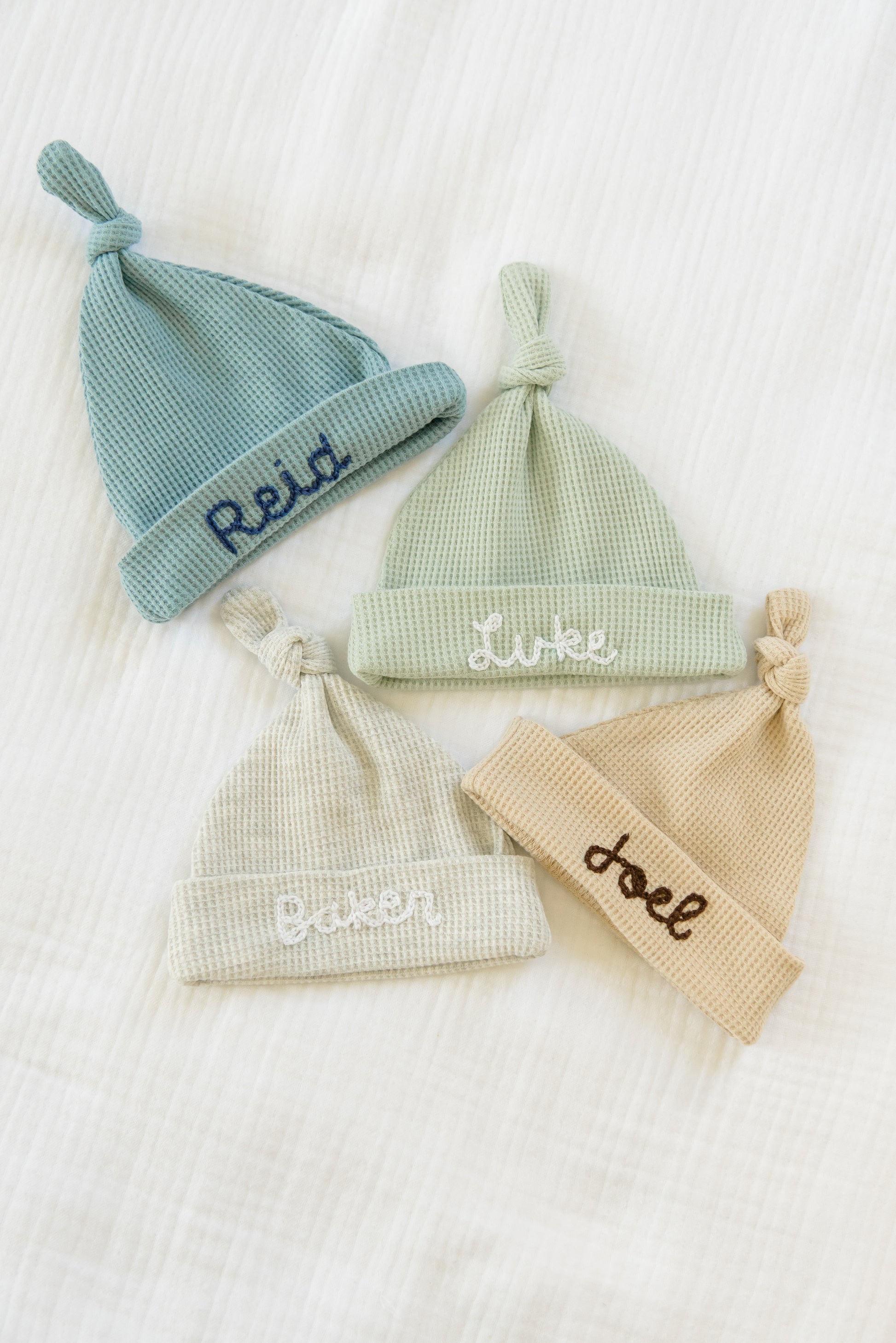 Our custom hand stitched waffle knit hats will make the sweetest addition to your baby's take home outfit. Hand stitched by Tori, a mama of 2, our adorable hats will not only keep your baby warm but will also make a sweet memento!