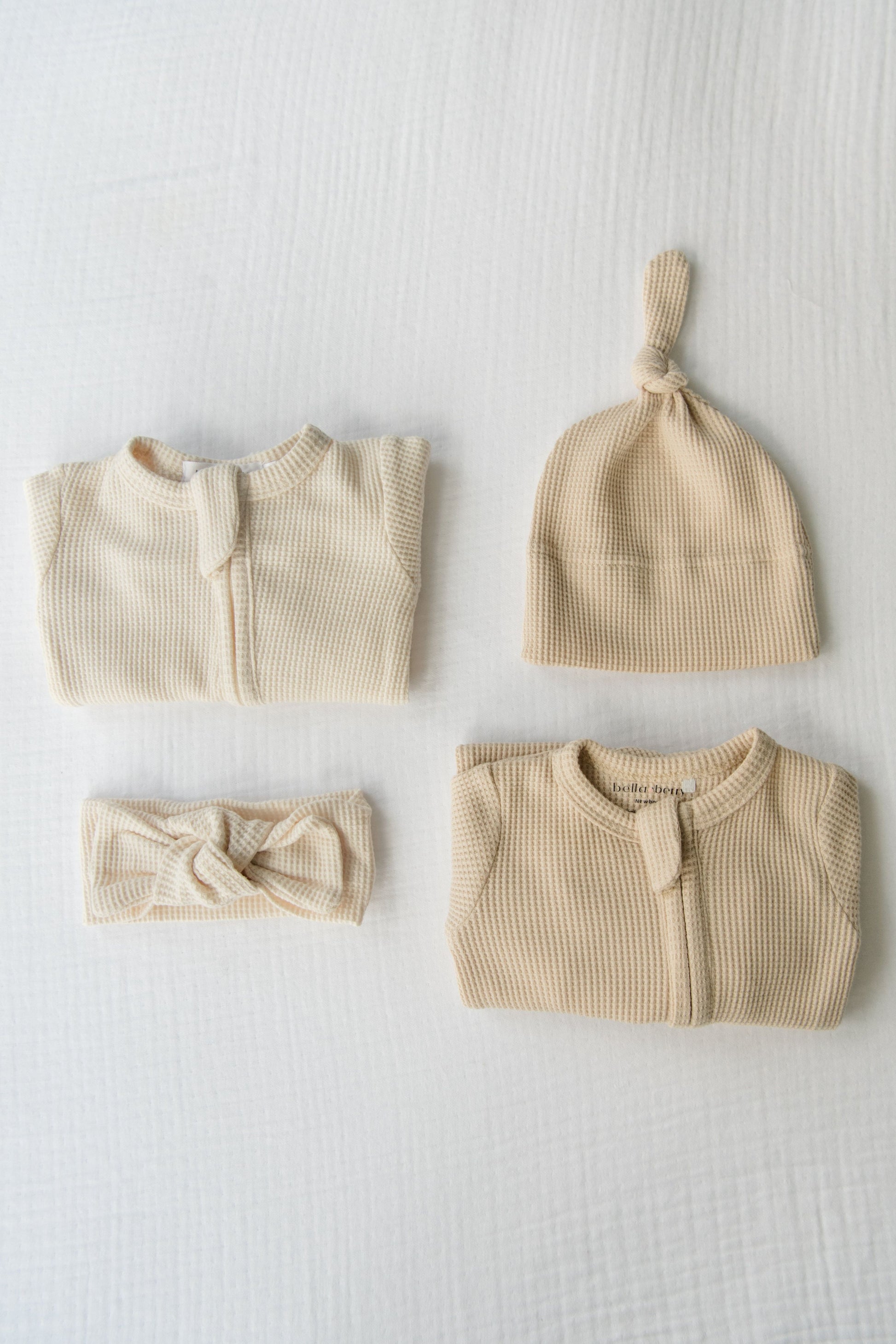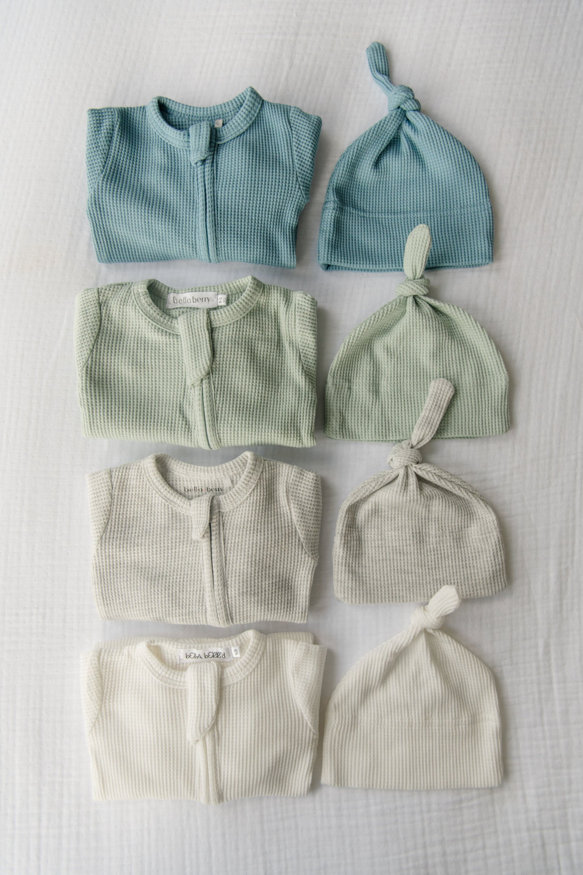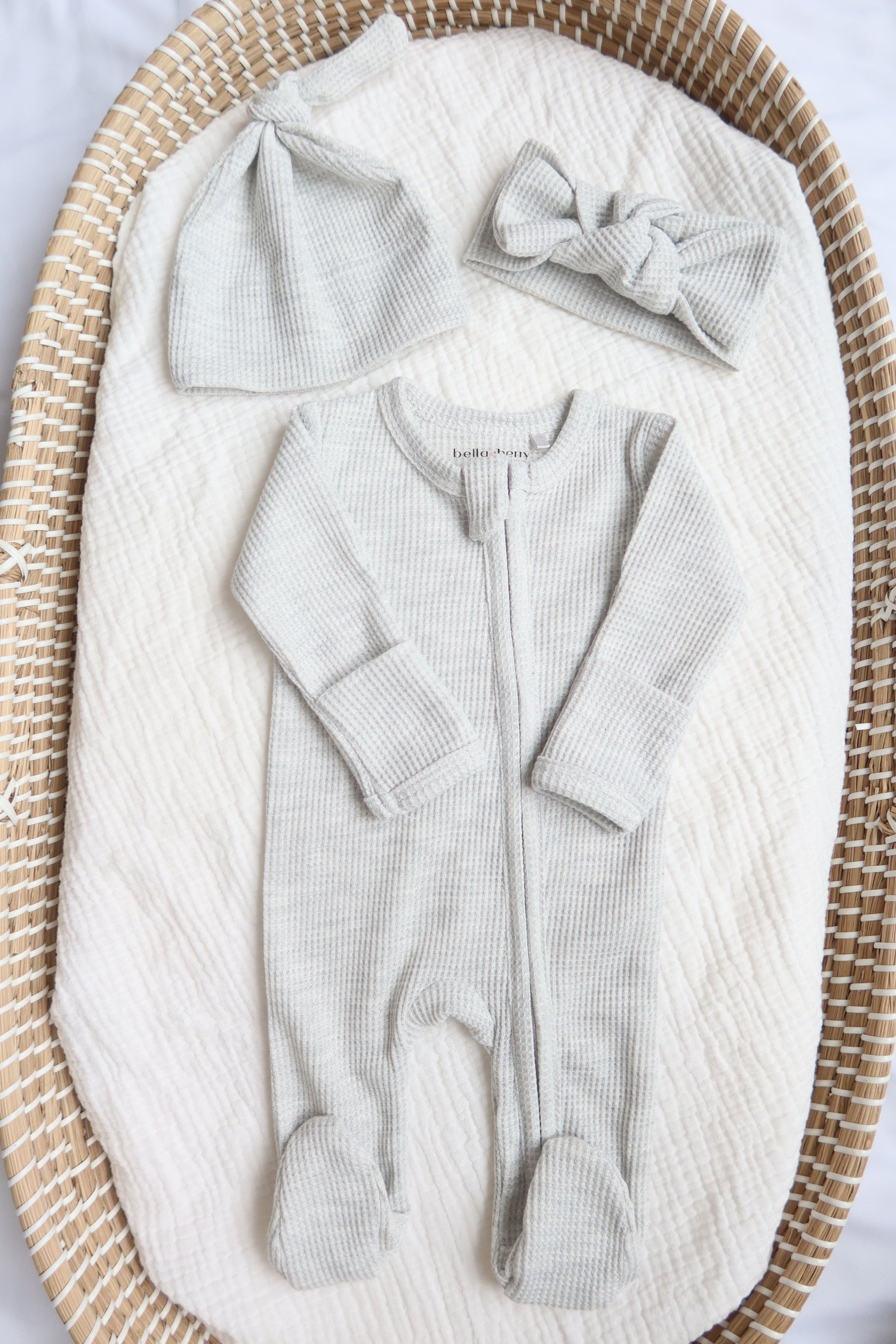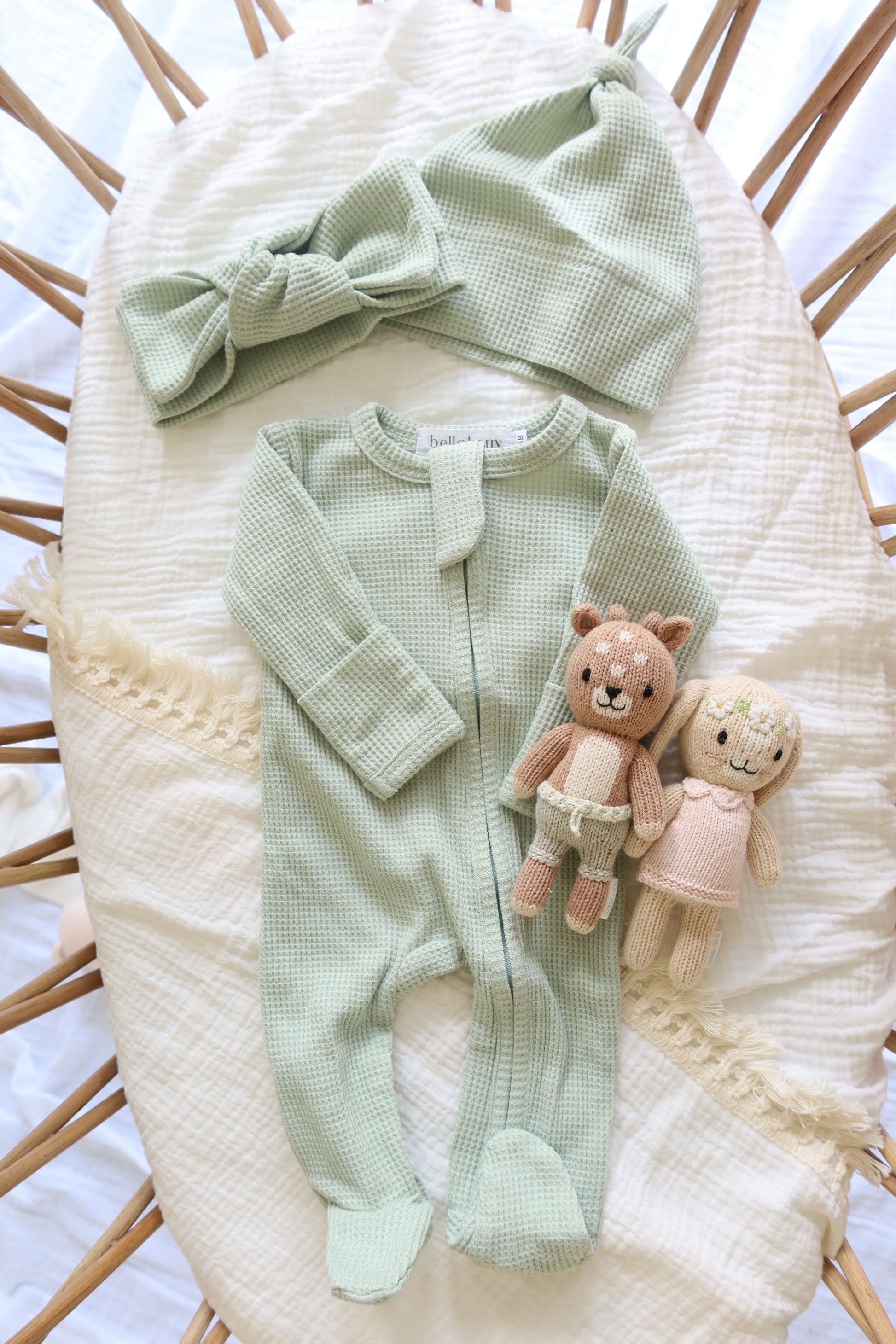 Take your baby home from the hospital in this sweet footie! Our organic cotton waffle knit footies feature a square waffle pattern, two way zipper, and fold over mittens. Purchase our color coordinating bow or hat to complete the look!