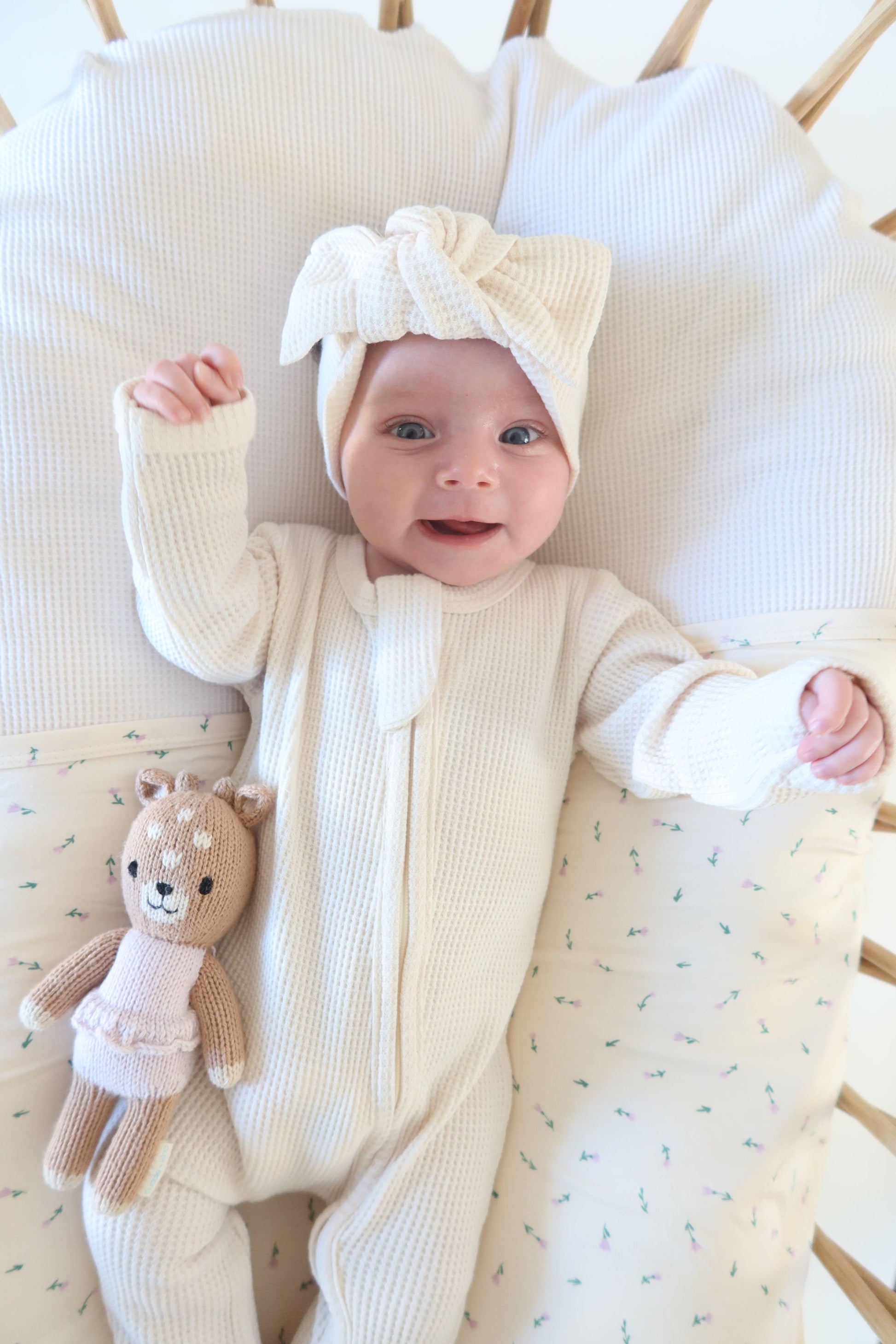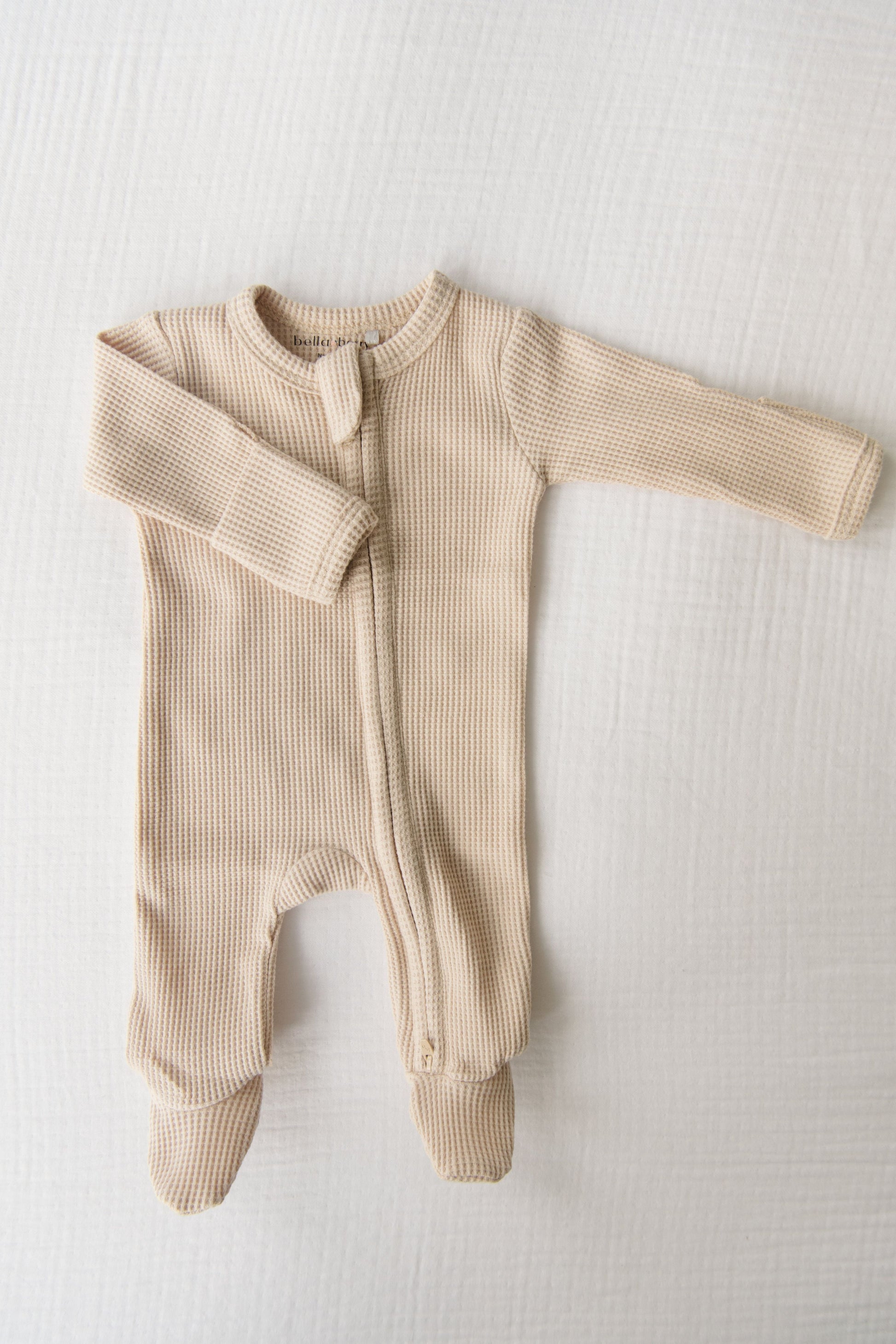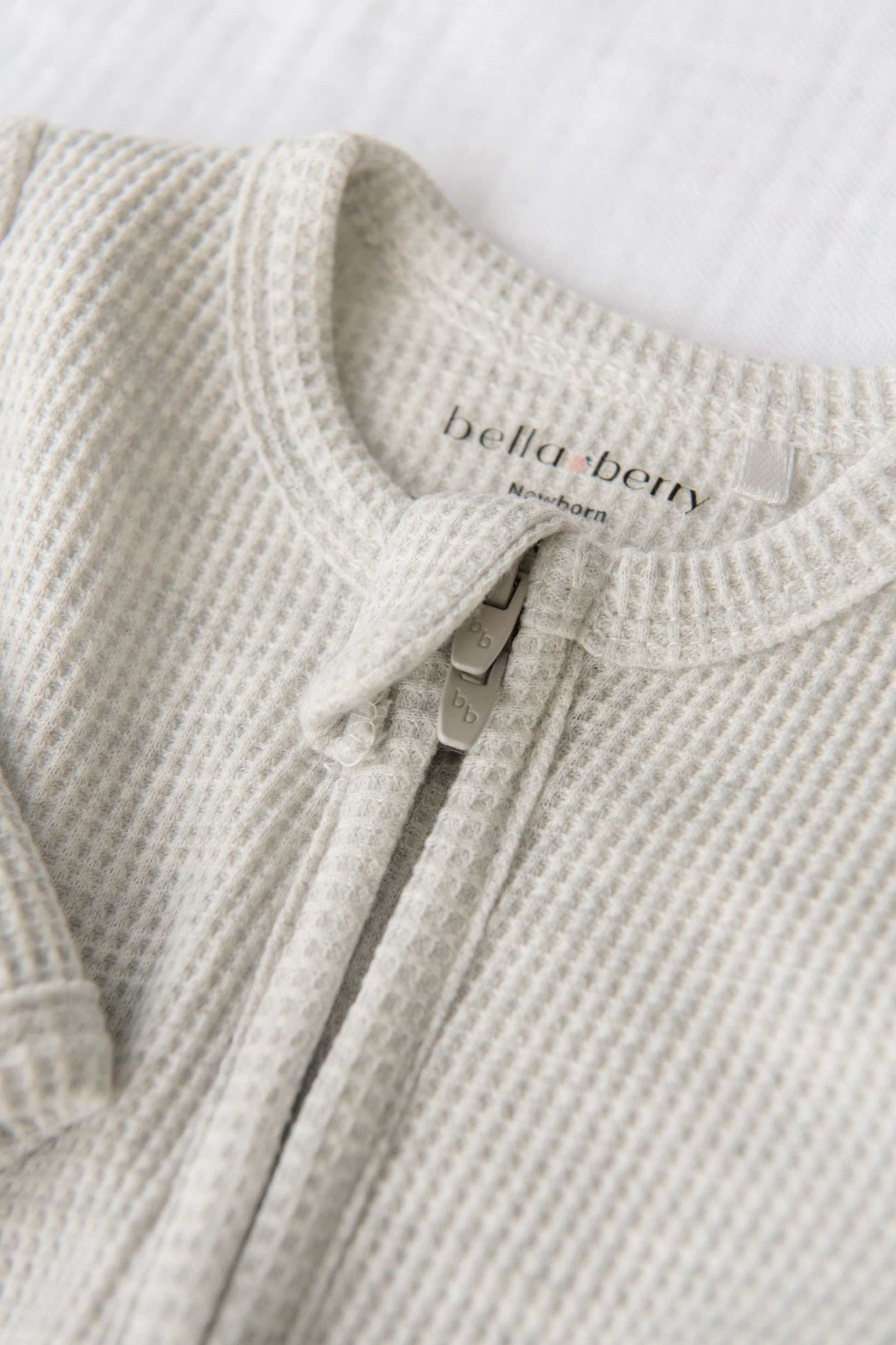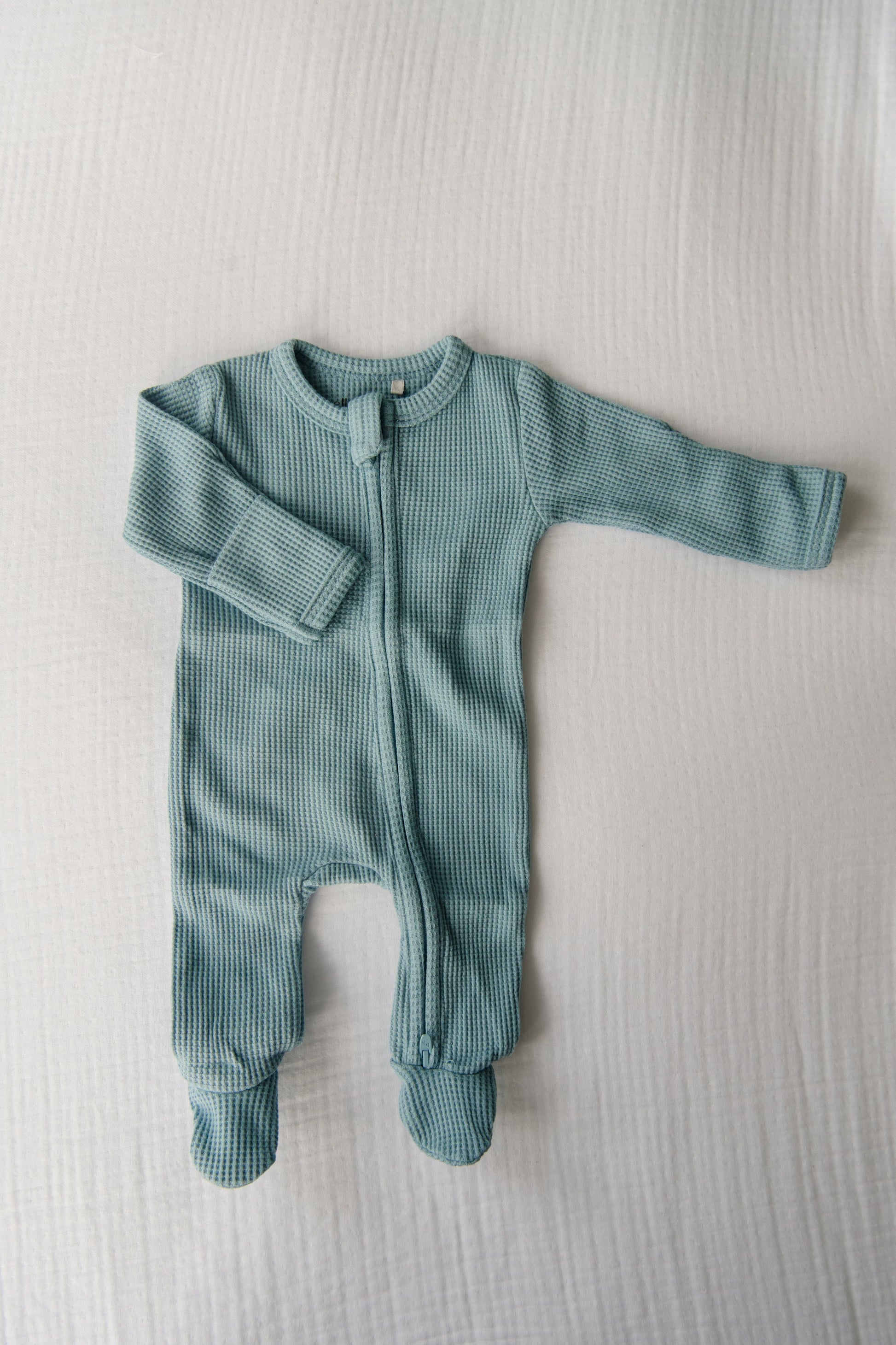 Take your baby home from the hospital in this sweet footie! Our organic cotton waffle knit footies feature a square waffle pattern, two way zipper, and fold over mittens. Purchase our color coordinating bow or hat to complete the look!