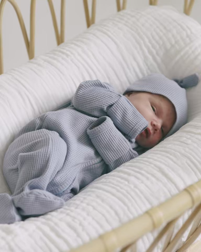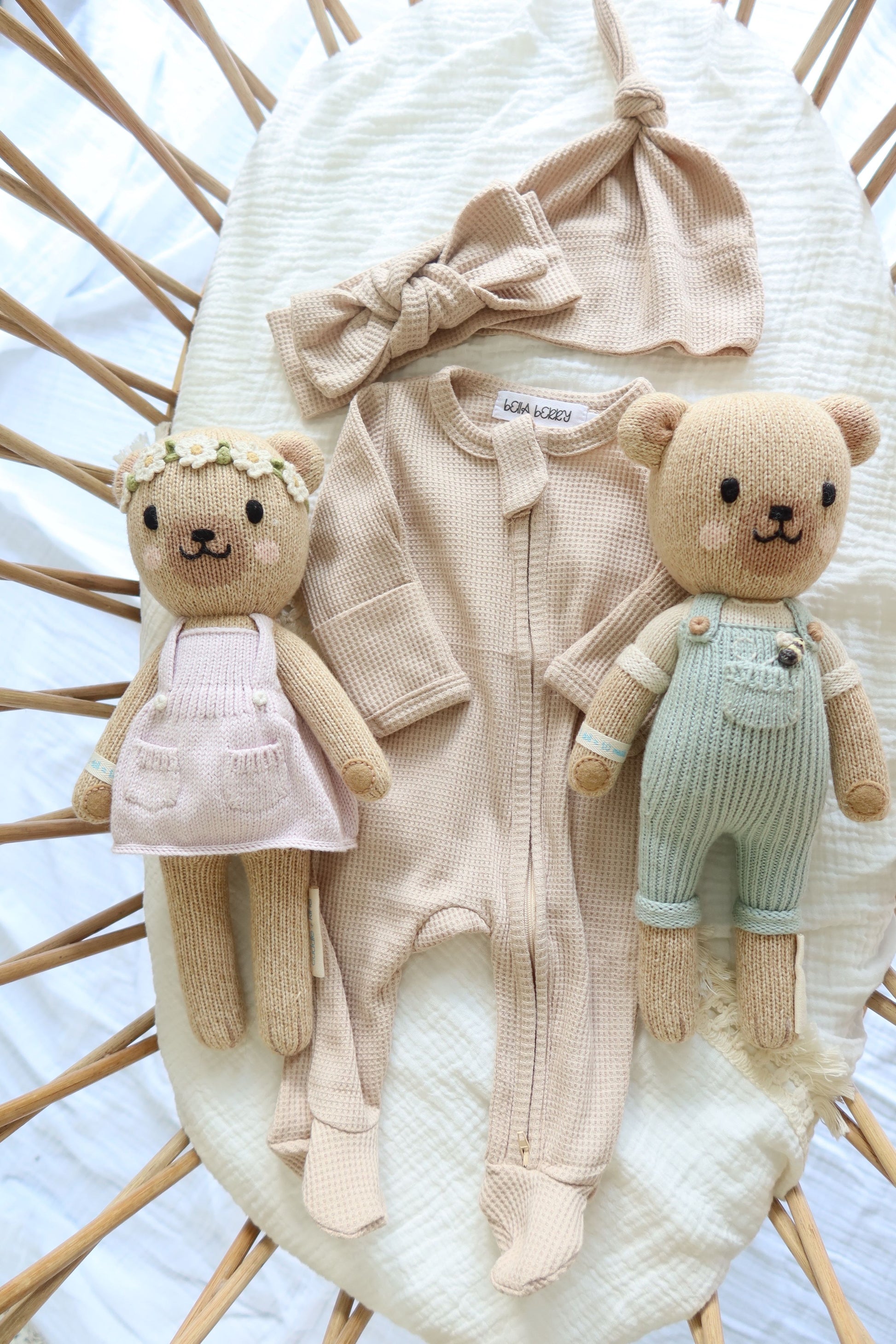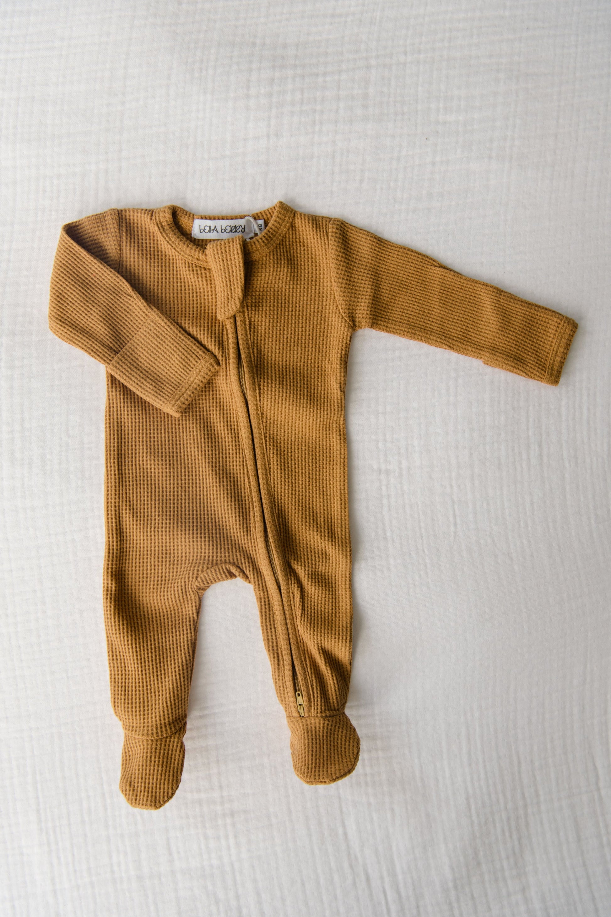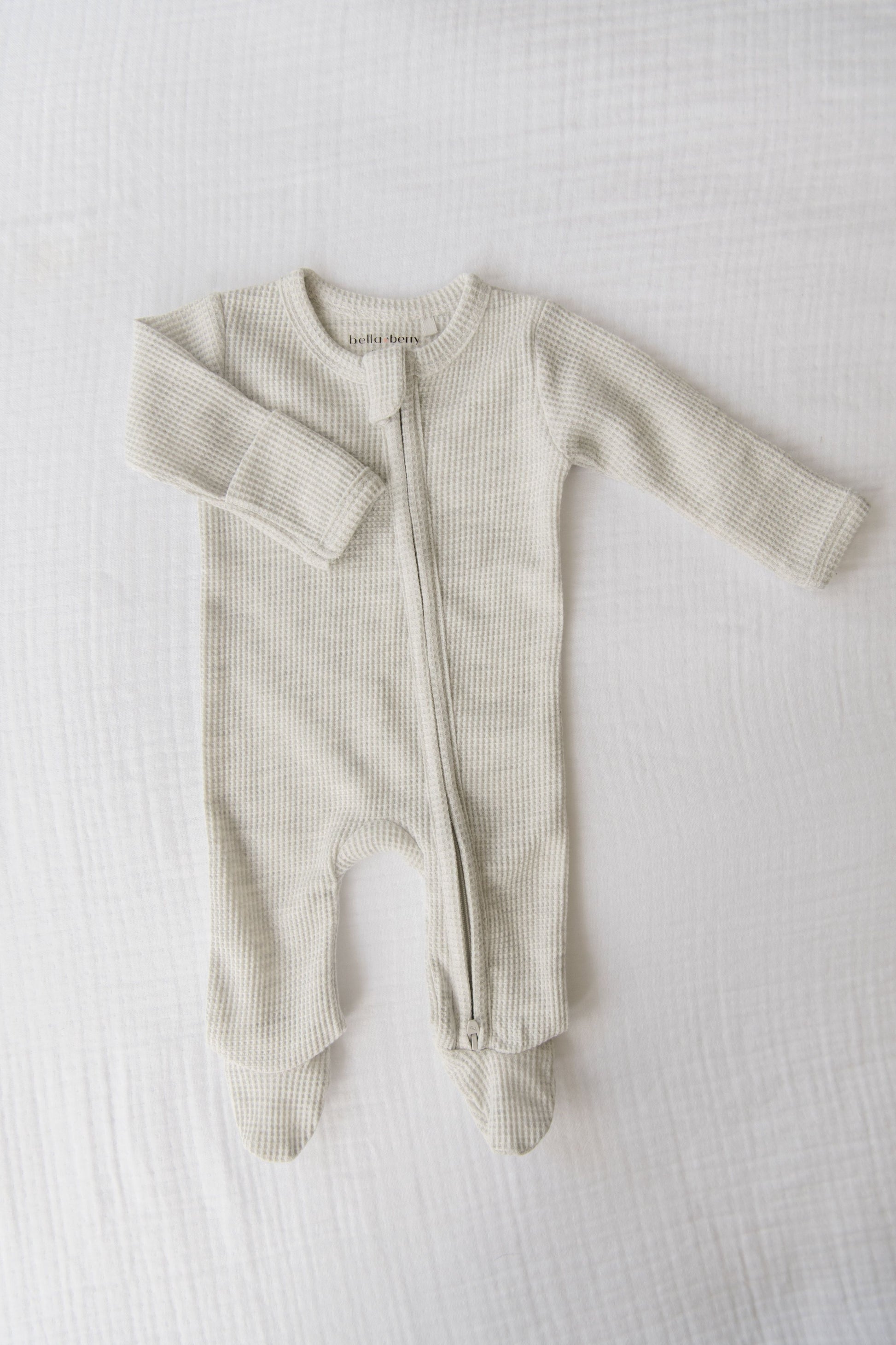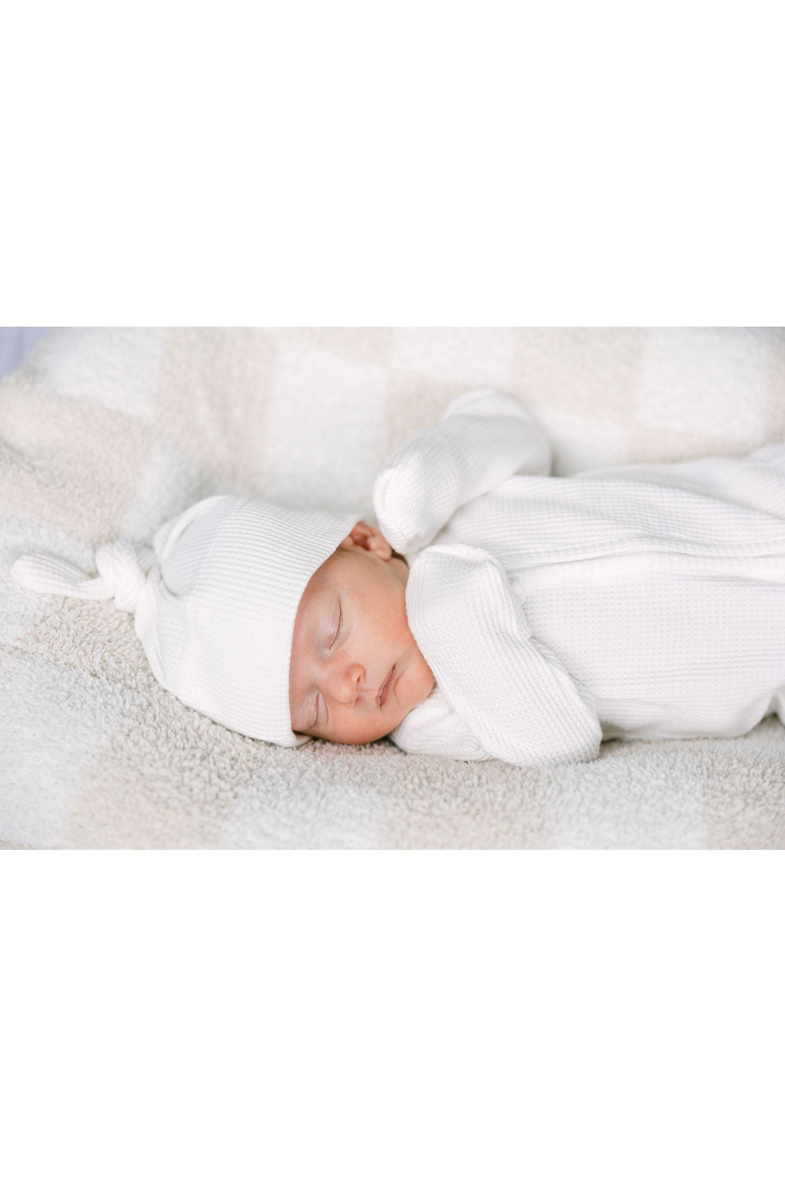 Take your baby home from the hospital in this sweet footie! Our organic cotton waffle knit footies feature a square waffle pattern, two way zipper, and fold over mittens. Purchase our color coordinating bow or hat to complete the look!
