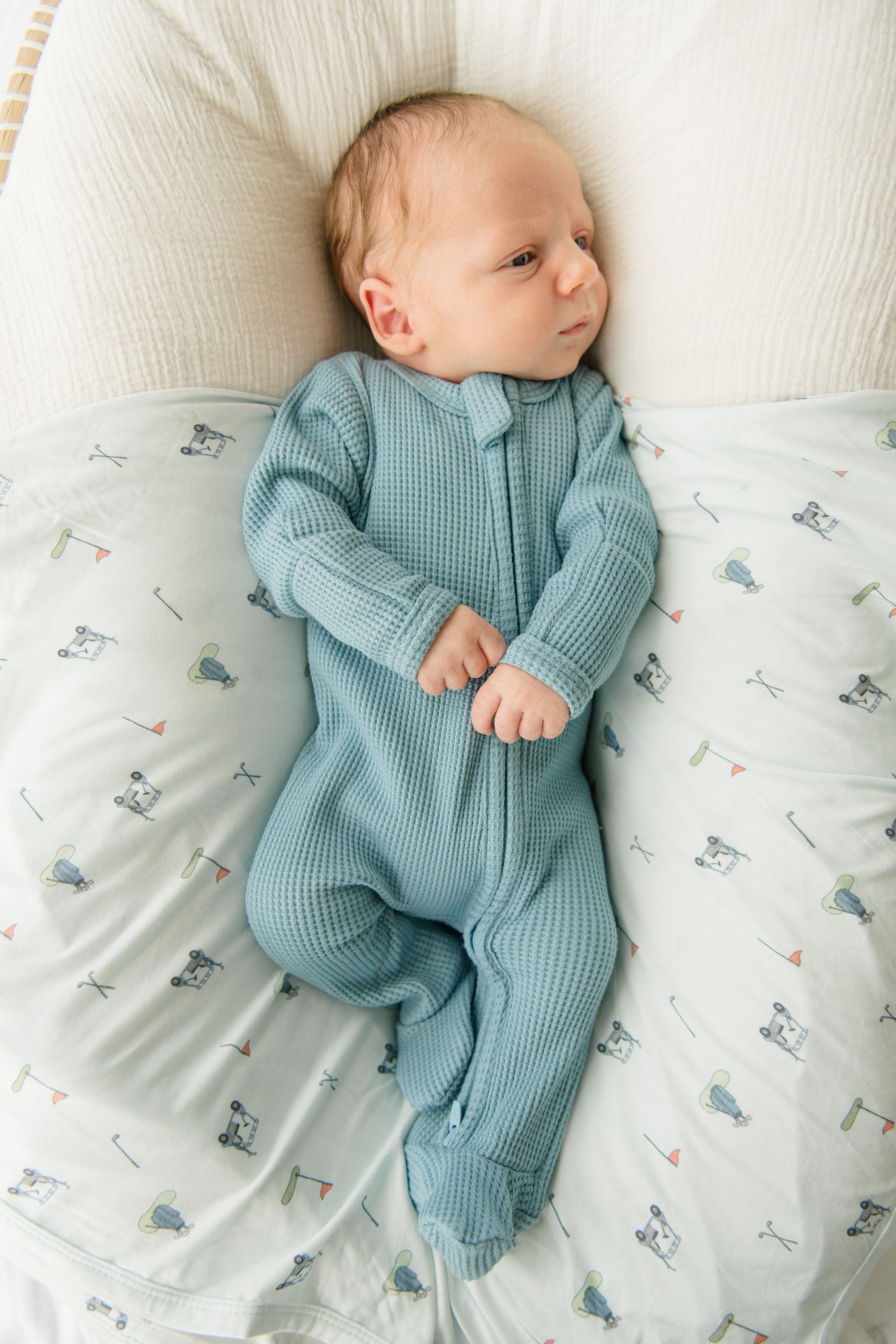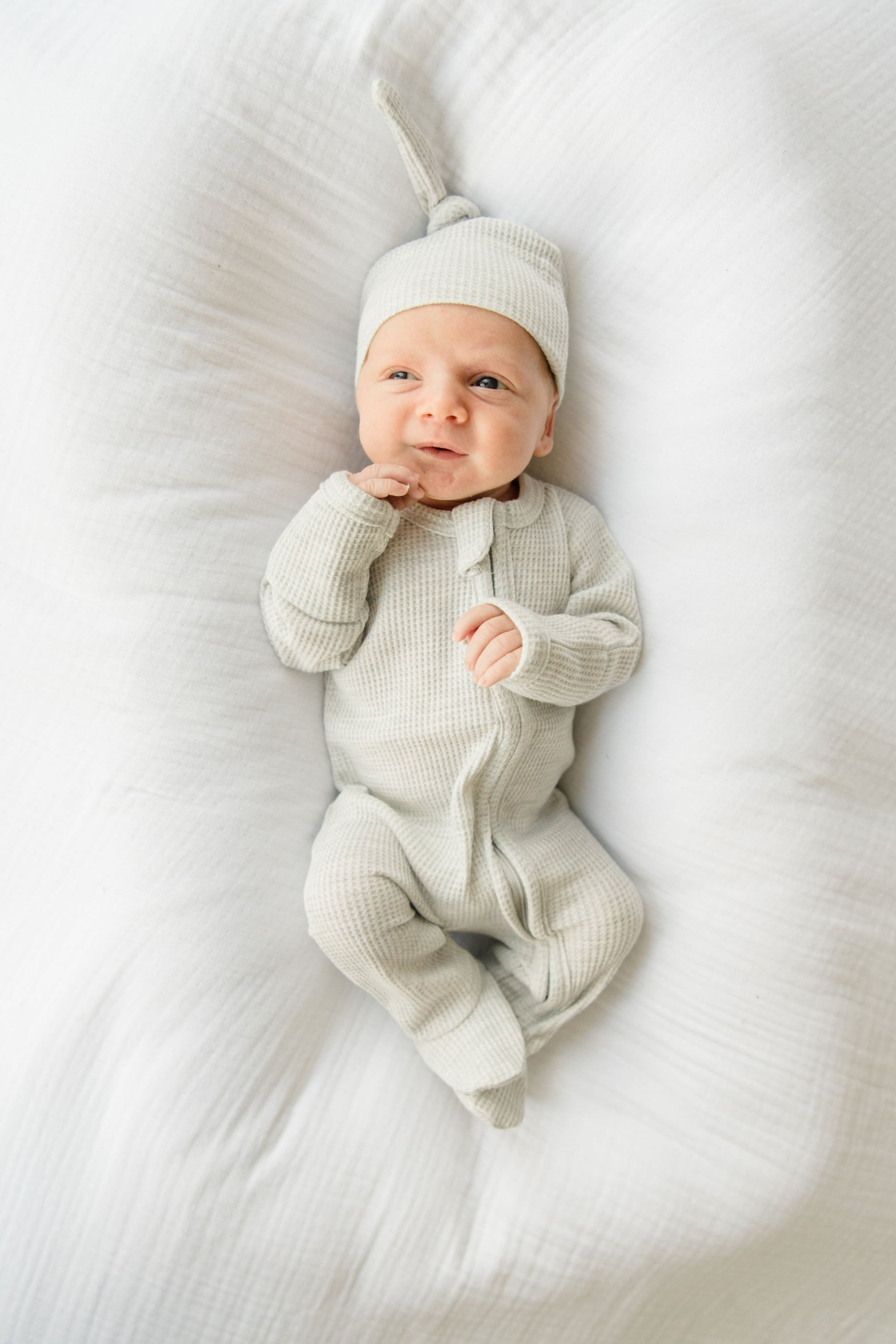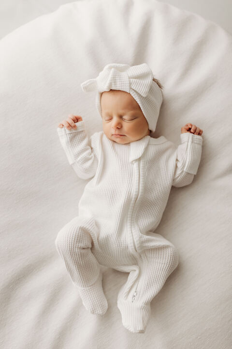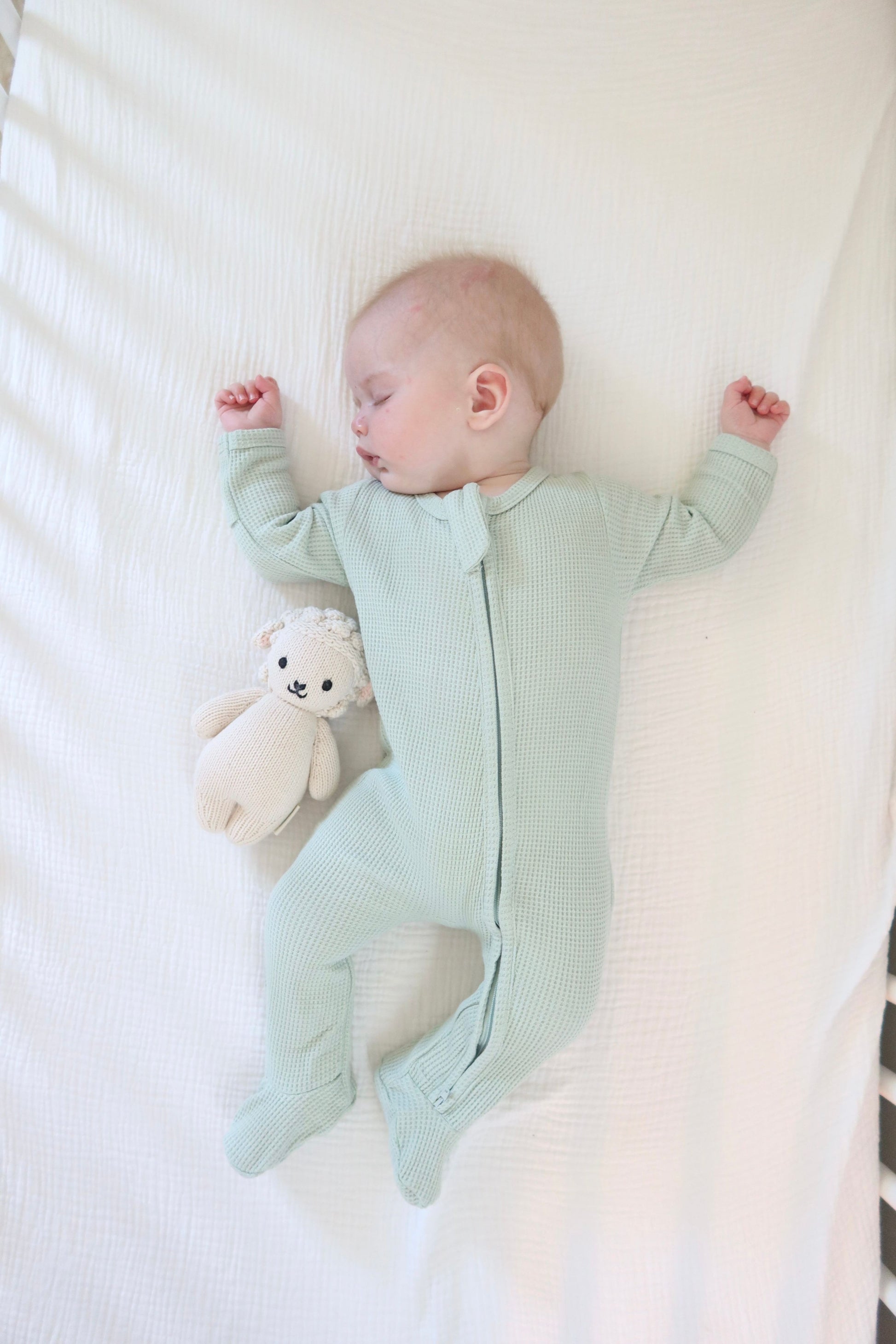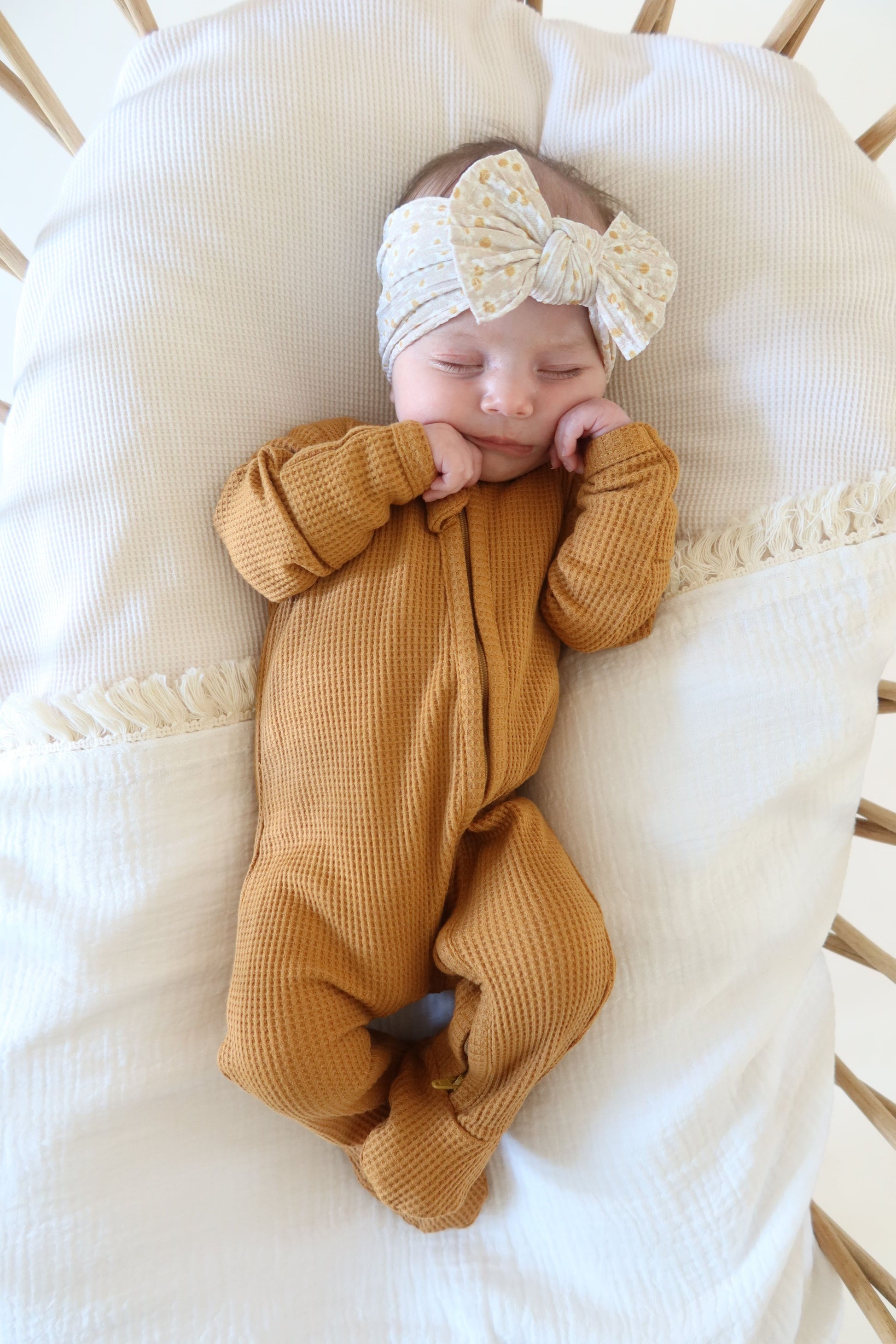 Take your baby home from the hospital in this sweet footie! Our organic cotton waffle knit footies feature a square waffle pattern, two way zipper, and fold over mittens. Purchase our color coordinating bow or hat to complete the look!