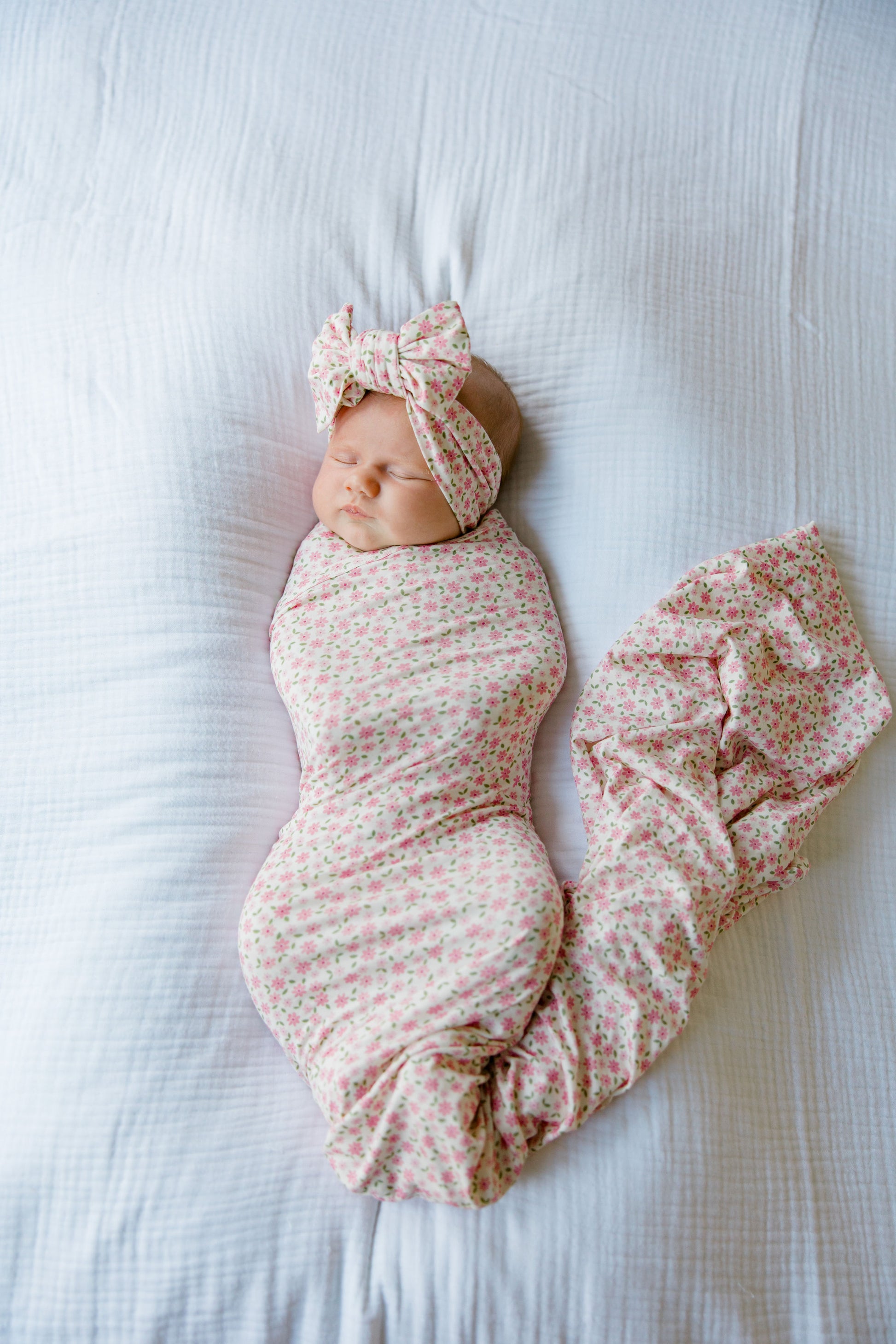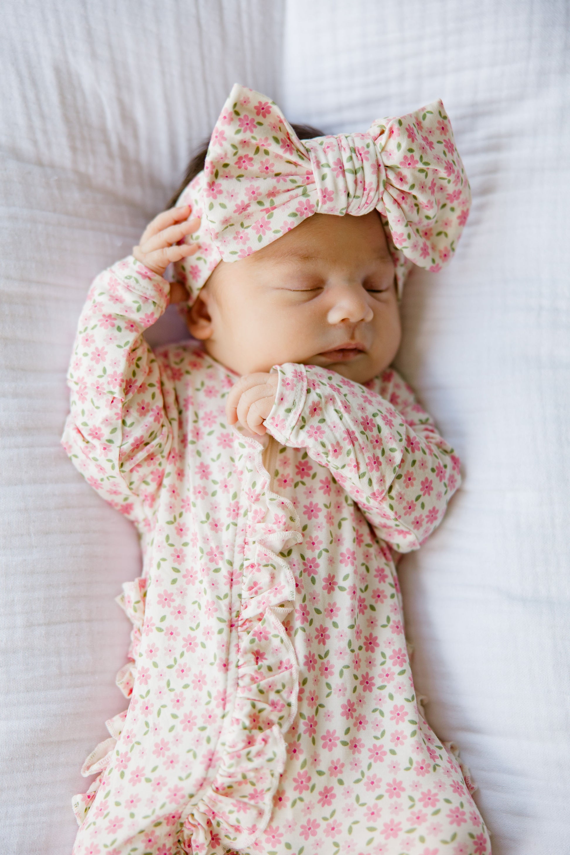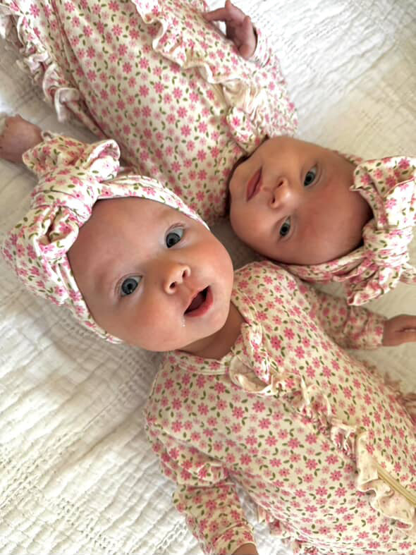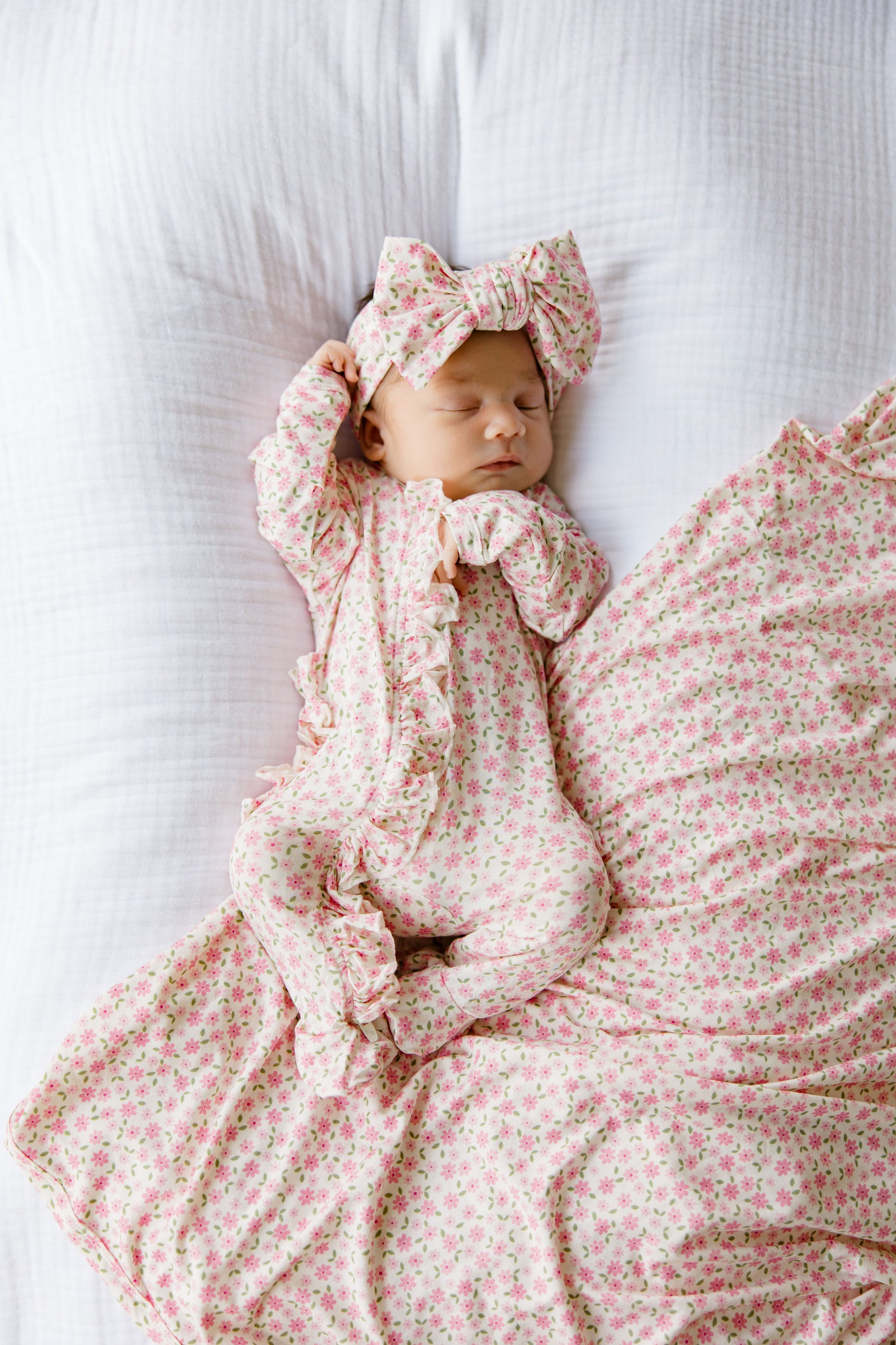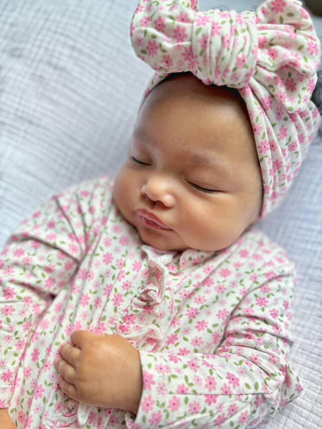 Little petals, lots of love! Our Pink Blossom collection has bloomed! Shop our exclusive bamboo pattern featuring dainty pink flowers! This collection features a double knot bow, ruffled footie and blanket/swaddle, making it the sweetest take home outfit for your newborn baby girl.