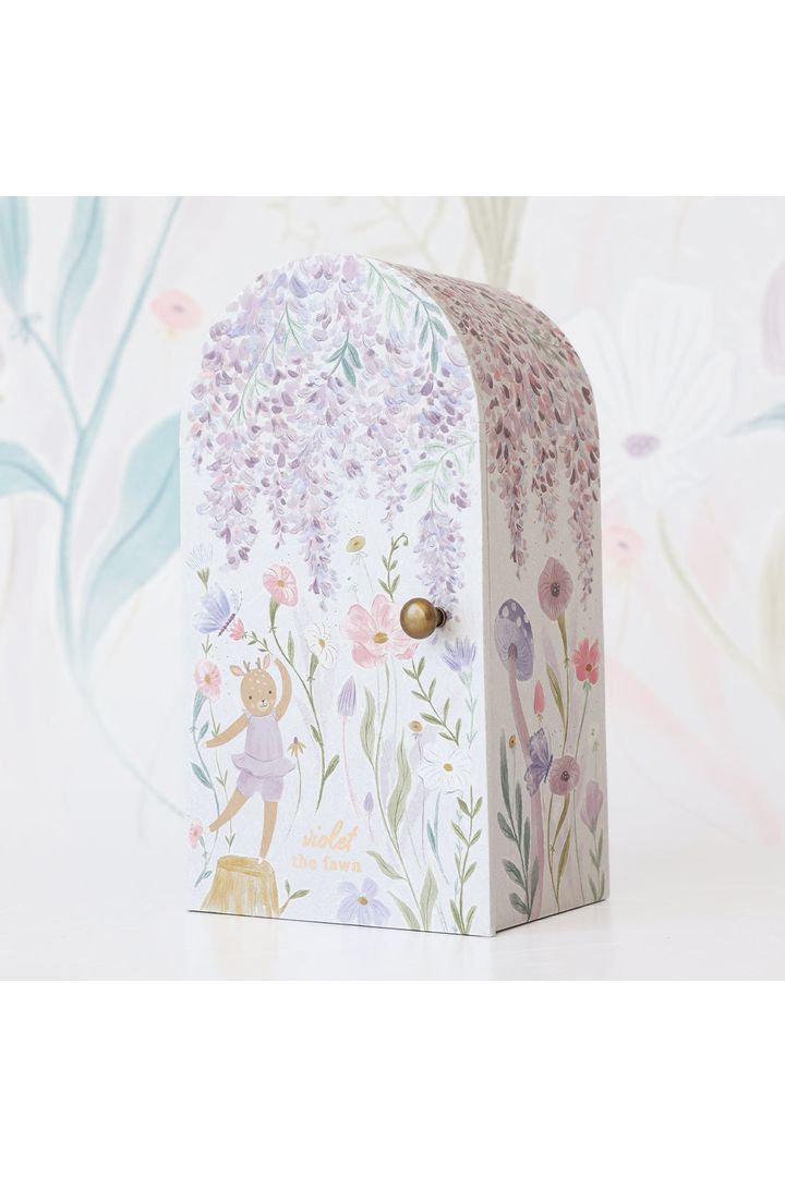 Each Tiny doll comes nestled in a Tiny home, with breathtakingly hand painted watercolor wildflowers and an antiqued bronze door knob that opens to a magical night scene full of twinkling copper foil stars. Collect all 6 to create a beautiful enchanted meadow!